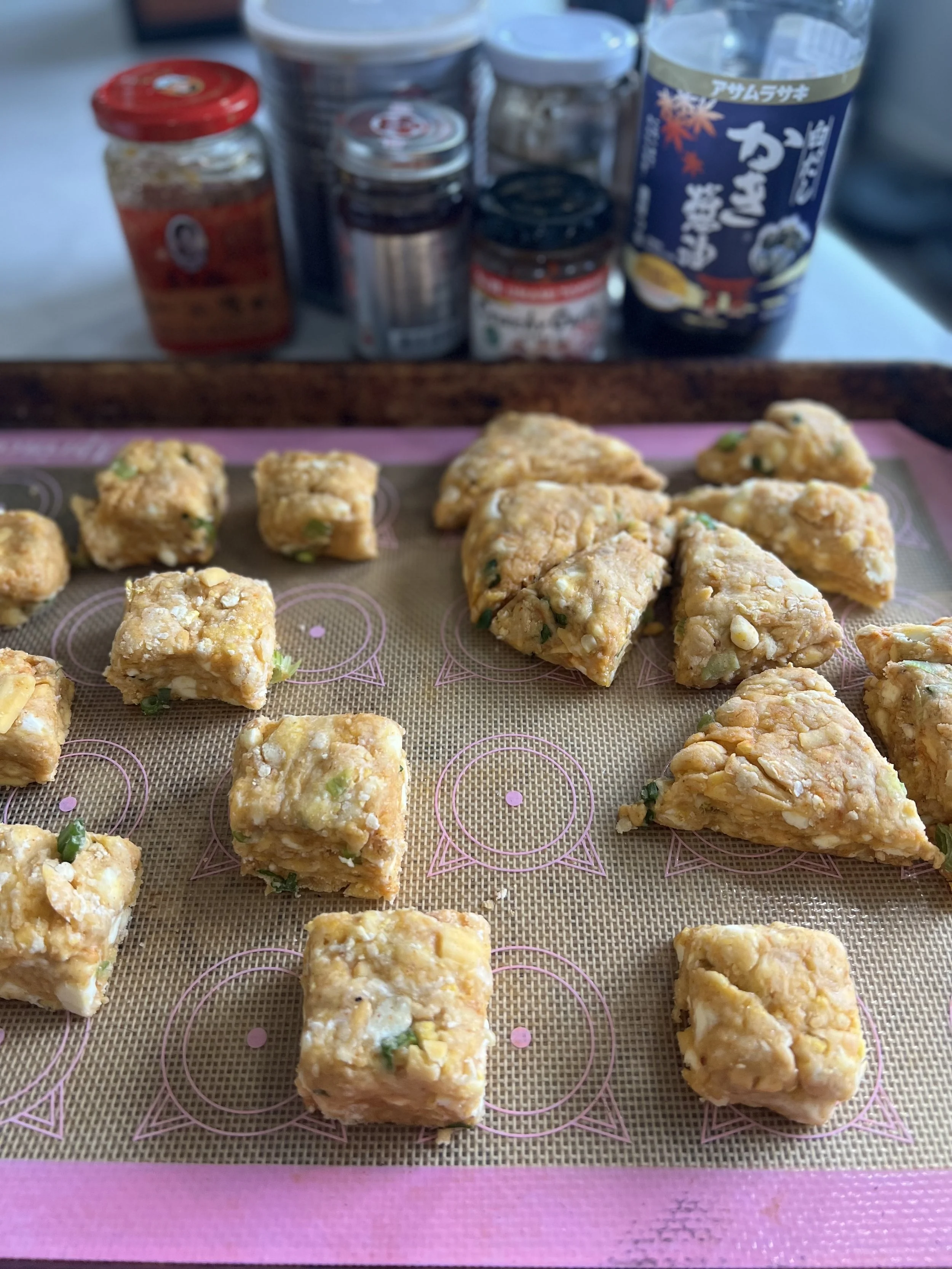 During the early days of COVID and now, my family and I enjoy hotpot at home, and I had a lot of sauces in the refrigerator. This morning, I thought of making sweet scones with chocolate and matcha but decided to go savory! I brought out a bunch of sauces that I’ve had forever and doesn't seem to go bad (wish us luck( such as Bullhead Barbecue sauce, Laoganma Chilli Oil Beancurd, sesame paste, soy sauce, and hot pot satay sauce. I minced up scallions and garlic and grabbed a handful of sharp cheddar cheese shreds (be generous with the cheese!) and mixed everything together, taste-tested, and my palate was in umami-bomb heaven. Feel free to change up your mix-ins and sauces. By the time I pulled the freshly-baked scones out of the oven, my kitchen smelled like HaiDiLao (a popular hot pot joint). My family loved these scones, they are cheesy, savory, and really hits the spot, especially when you’re nostalgic for hot pot!