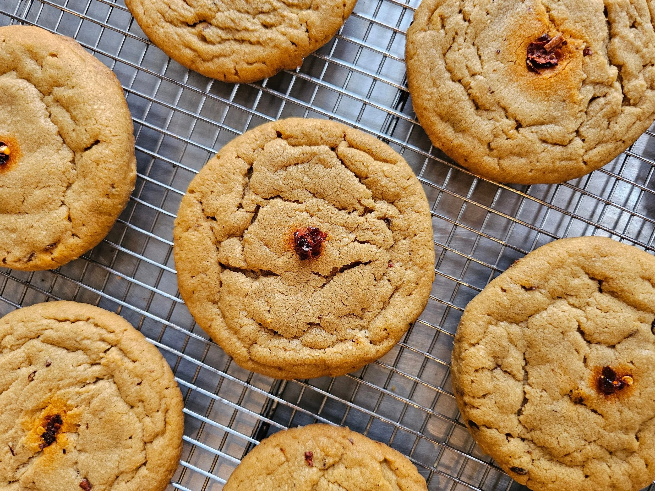 Hi there! If you are the kind of person who puts chili crisp on everything, this is the recipe for you. The inspiration for these cookies comes from cold spicy peanut noodles, it's the perfect flavor profile to morph into something sweet. Nutty and umami with a caramel finish, the chili crisp lends a nice depth of flavor and unforgettable spice. I use the classic Lao Gan Ma, but feel free to use your favorite brand. I suggest using the actual crisp part versus just the oil, so you don't change the ratio of wet to dry ingredients too much.