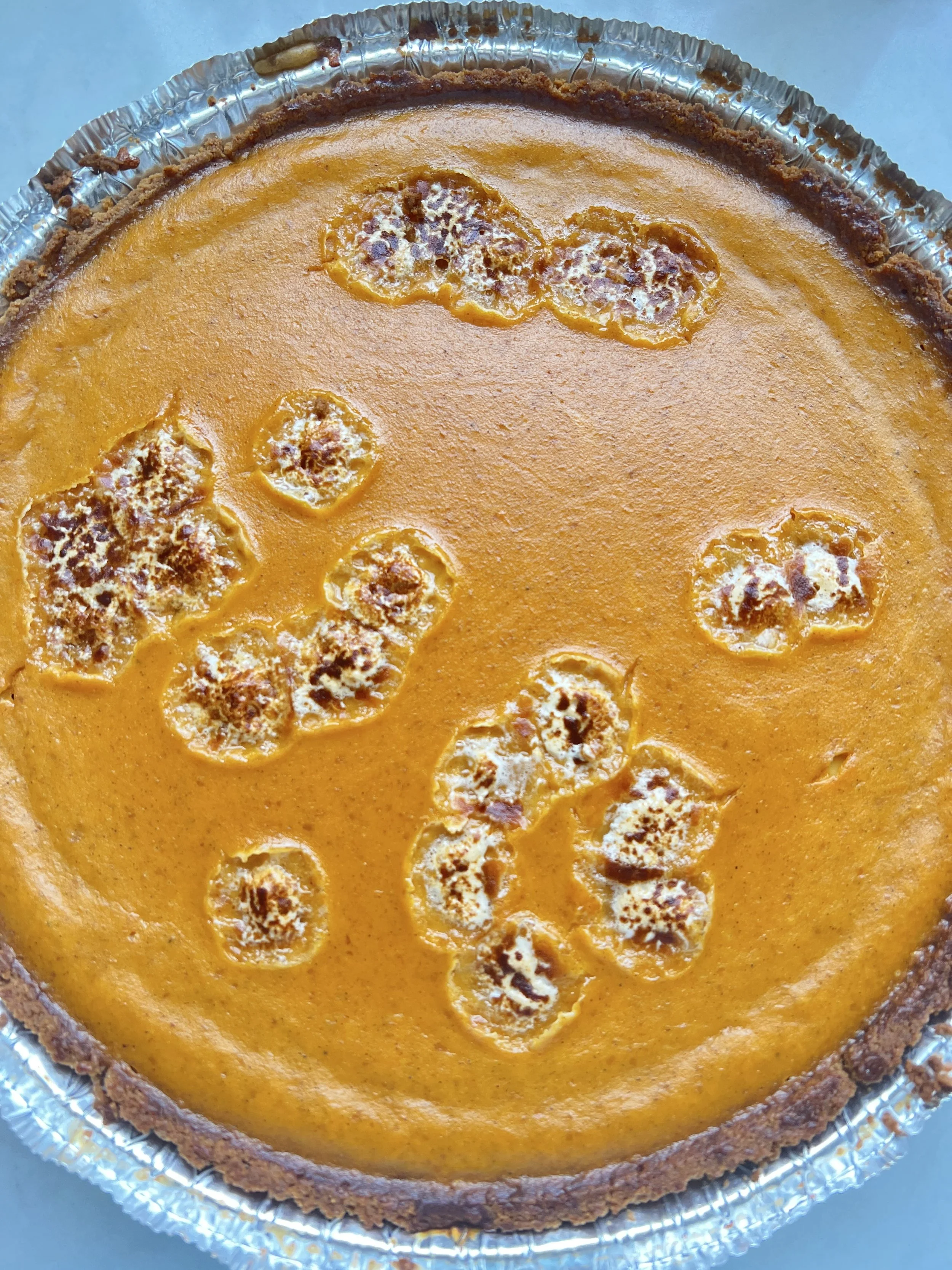 My mother rarely baked. We never made cupcakes together, or cookies, but she did love baking two things: a simple NY-style cheesecake and a chiffon cake with a recipe my MaMa (paternal grandma) had passed down. My mom never made her own pie dough from scratch. She always used the store-bought version, and that was OK. Everyone loved her cheesecake with the store-bought pie crust. Today, I’m not ashamed to use a ready-made pie crust when I make my pumpkin pies. The holidays can be super stressful, especially during a never-ending pandemic. Why worry about the little things? Everyone will still love this pumpkin pie (unless they hate pumpkins and think pumpkin spice is anything but nice!). Stress less, and make an ugly-beautiful pumpkin pie this Thanksgiving. Change up the spices to call it your own, and impress all the kiddos and adults who are still kiddos with a gooey layer of burnt marshmallows. Dollop on whipped cream and serve chilled or warmed in the oven, with a nice cup of tea.